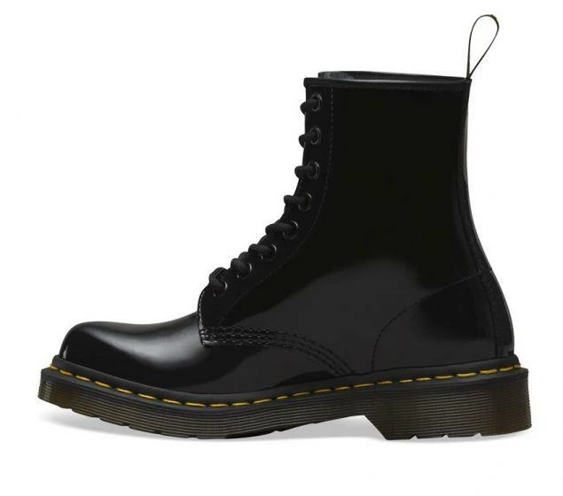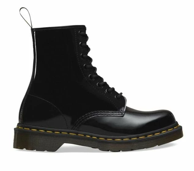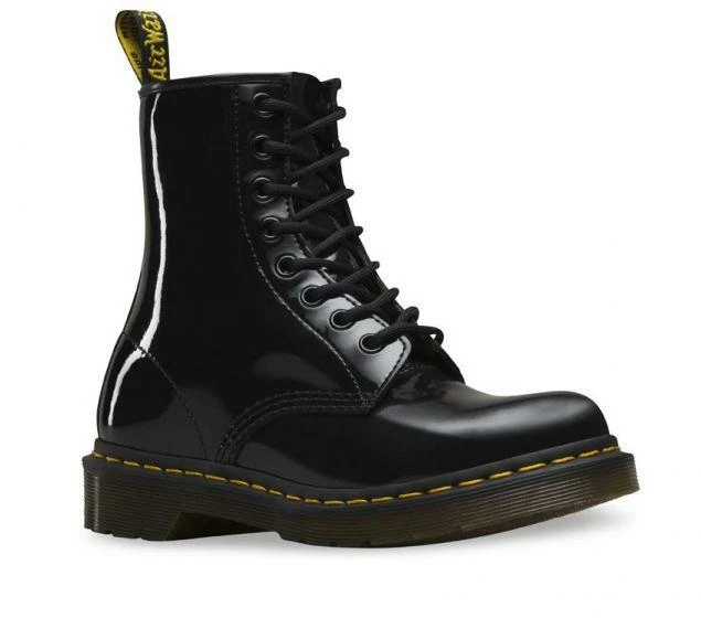 A new leather for an old classic: this iconic 8-eye women’s boot shines bright in glossy patent. This 1460 has all the classic Doc’s DNA, including grooved sides, heel-loop and yellow stitching. Built to last, it’s made using one of the finest methods of construction: the Goodyear Welt — which means the upper and sole are sewn together in our heat-sealed z-welt stitch. The boot sits on our iconic AirWair™ sole, which is oil and fat resistant, with good abrasion and slip resistance.