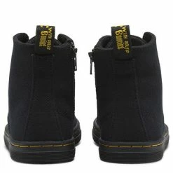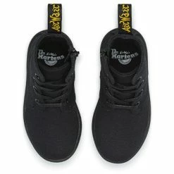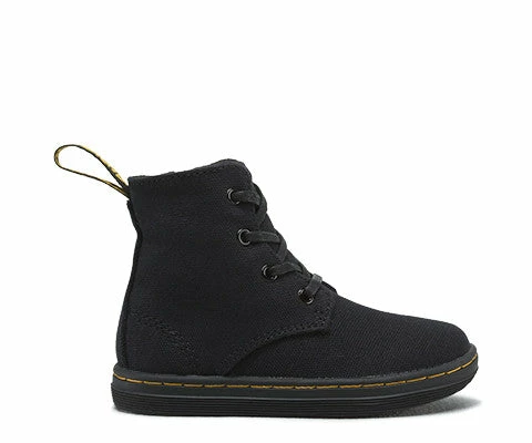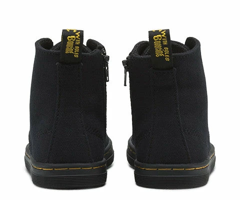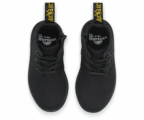 The Eclectic 4-Eye Lace Boot offers classic black colour on a contemporary canvas. The style is an exact mini replicas of the adult range. Bright yellow stitching, a supple, grippy sole and flat black laces complete a very fashionable look. Infants 4-Eye Lace Boot Canvas: has a traditional weaveThe sole is stitched and cemented to the base of the upper and to the insole. Dr. Martens air-cushioned sole offers good abrasion and slip resistance.