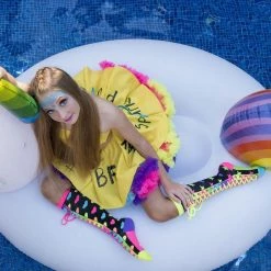 She leaves confetti wherever she goes, while wearing her Confetti Socks. Confetti Socks are a mix and match pair of rainbow stars and hearts to make you feel like you are at a party all day, every day! Complete with a yellow and a pink shoelace topper.
