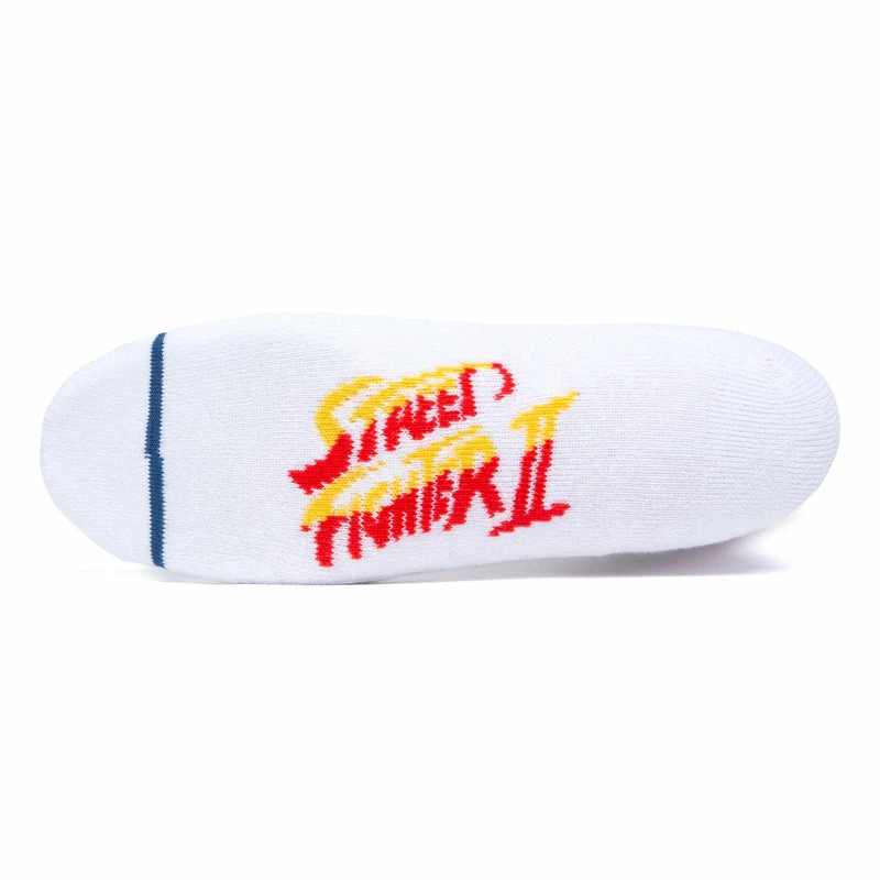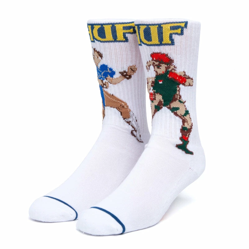 The Chun-Li & Cammy Sock is part of the HUF x Street Fighter Collaboration—celebrating the iconic 16-bit arcade game of the late-80s and 90s. The game’s Chun-Li and Cammy characters are featured in lo-res pixelated graphics at the upper, while Street Fighter II’s retro gradient logo is applied to the footbed.